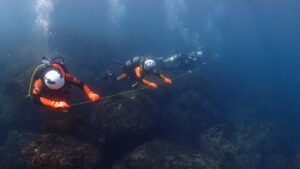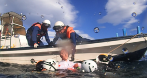 訓練シナリオは、堤防で釣りをしていた男性2人が高波にさらわれ、1人は水面を漂流、もう1人は水中に沈んでしまうというもの。 水面の要救助者は海保救難艇が救助、水中の要救助者は消防水難救助隊と当DRS救難所の救助員が合同で円形捜索を行い、発見→引上げ→救助船へ揚収→CPRを実施しながら港へ搬送しました。
